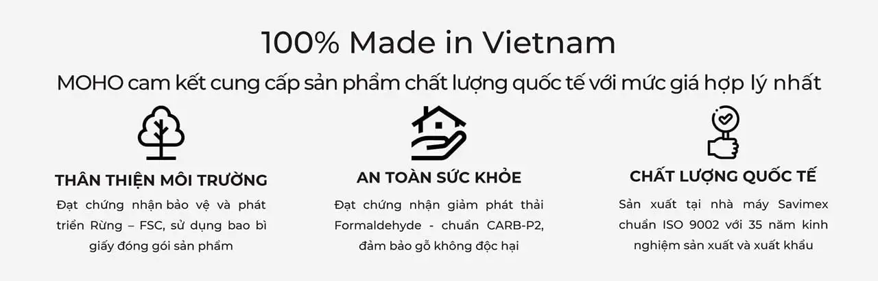 Sản phẩm sử dụng chất liệu gỗ công nghiệp (MFC, MDF) đạt chuẩn CARB-P2 an toàn tuyệt đối cho người sức khỏe người dùng và đạt chứng nhận FSC bảo vệ và phát triển rừng.